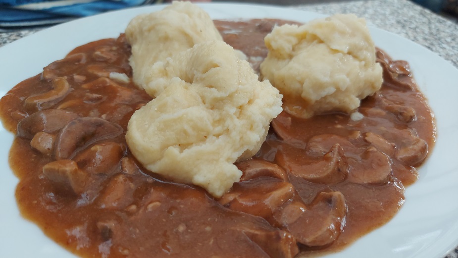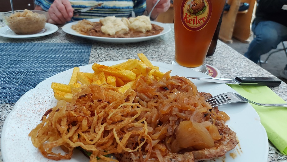 An einem der letzten schönen Terrassenabenden zum Draußensitzen gab´s zu ein paar guten Kellerbieren von der stets perfekten Tageskarte zwei außergewöhnliche Gerichte: Mit Beilagensalat und Pommes Frites das Zwiebelsteck vom Schweinerücken und zu Mehlklößen und Sauerkraut die sauren Nieren, die man eher selten in einem Wirthaus bekommt.