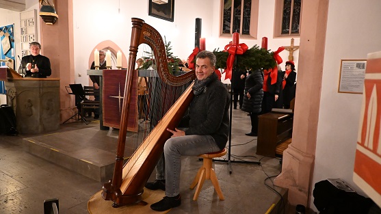 Luigi A. Parente aus Mühlhausen sorgte mit seiner Harfe für eine besondere adventliche Atmosphäre. Links der Hauptinitiator Reinhold Lamprecht.