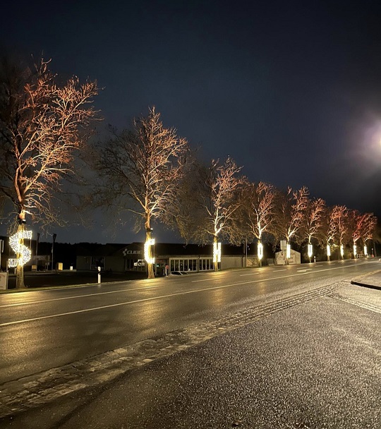 Immer wieder sorgen die originellen Ideen des Bauhofleiters Philipp Nees und seines Teams für Staunen und Bewunderung. Vergangenes Jahr war der Lichtertunnel ein markanter Selfie-Hotspot. Aber auch mit Lichterketten in den Bäumen, Sternen oder übergroße Adventskränze aus Holz sorgt die Großgemeinde für Begeisterung. An der Verkehrsinsel der Hauptstraße stehen wieder die beliebten Holzweihnachtsbäume, die speziell mit Holzlatten in Form gebracht wurden.