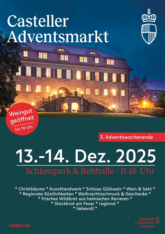 Die Fürstlich Castell´schen Domäne präsentiert frisch degorgierte Sekte, gereifte Weine und hat die Vinothek an beiden Tagen bis 18 Uhr geöffnet. Freuen können sich Besucher auf einen ein stimmungsvoller Weihnachtsmarkt der besonderen Art.
