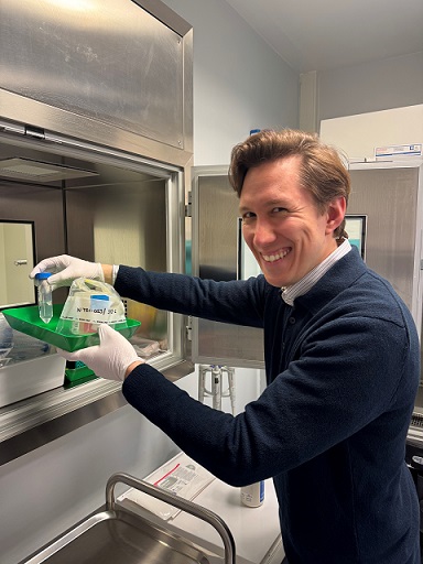 Der Leiter der Qualitätskontrolle in der Arbeitsgruppe von Privatdozent Dr. Oliver Pullig am Lehrstuhl für Funktionswerkstoffe der Medizin und der Zahnheilkunde des Universitätsklinikums Würzburg, bringt heute gemeinsam mit dem Würzburger Team den ersten im Rahmen der europäischen klinischen ENCANTO-Studie gezüchteten Knorpel aus der Nase eines Patienten zur Behandlung seiner Kniegelenk-Arthrose auf den Weg.