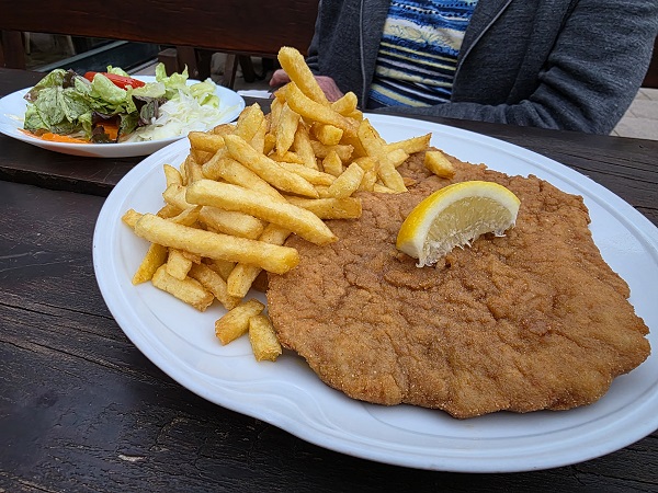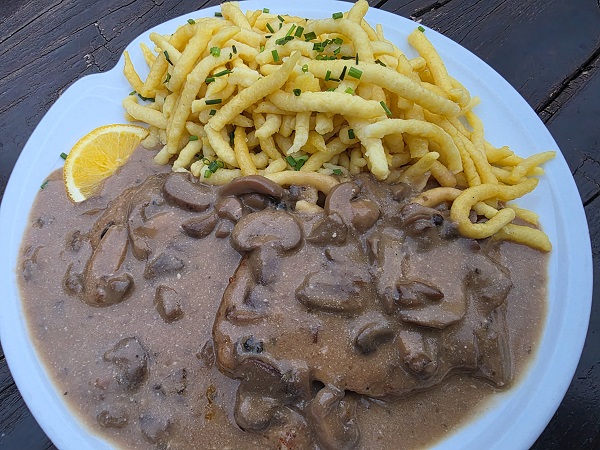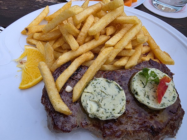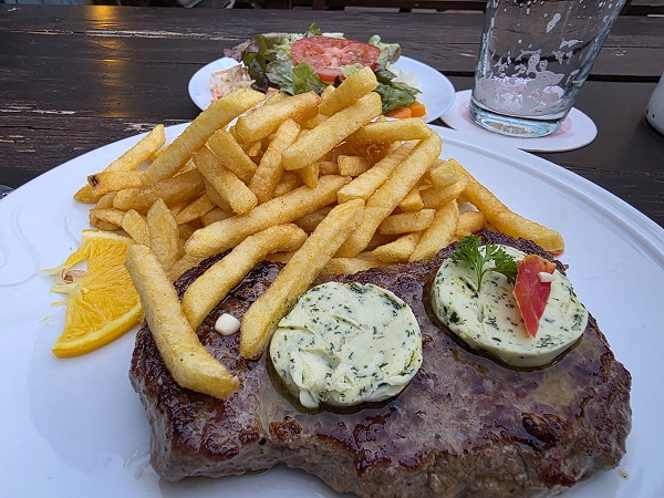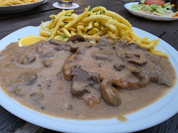 Diesmal gab´s zu jeweils einem Beilagensalat nochmals das Schnitzel Wiener Art und das Rumpsteak mit Kräuterbutter, jeweils mit knusprigen Pommes Frites sowie das Jägerschnitzel mit Spätzle. Wo kann man eigentlich besser essen als in Oberschleichach?