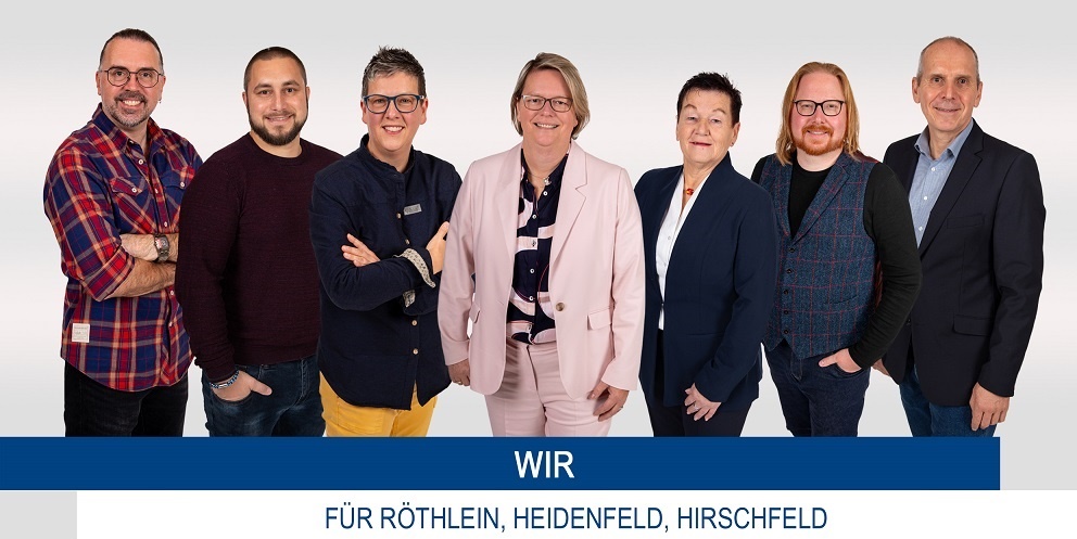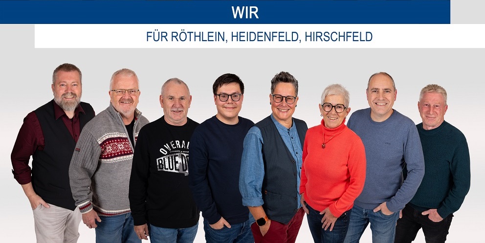 Die Liste vereint Kandidatinnen und Kandidaten aus allen drei Ortsteilen: Martina Braum (Heidenfeld), Petra Jakob (Röthlein), Claus Christ (Heidenfeld), Peter Brembs (Röthlein), Christine Breunig (Röthlein), Christian Oeser (Röthlein), Nadine Simon (Hirschfeld), Daniel Beck (Heidenfeld), Tania Schaupp (Hirschfeld), Sven Schmeußer (Röthlein), Michelle Oeser (Heidenfeld), Winfried Zeisner (Heidenfeld), Martin Sterker (Röthlein), Michael Morawetz (Heidenfeld), Siegfried Hetterich (Heidenfeld), Peter Büchner (Heidenfeld).