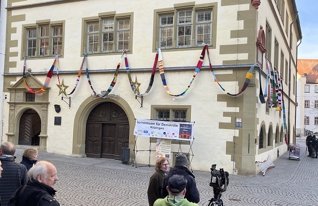 KITZINGEN – Dem Rathaus in Kitzingen dürfte es in diesem Winter nicht mehr kalt werden – und den vielen Mitstreitern der Aktion ist es in den letzten Tagen auch schön warm geworden. Sage und schreibe 100 Meter misst der erste Kitzinger „Schal für die Demokratie“.