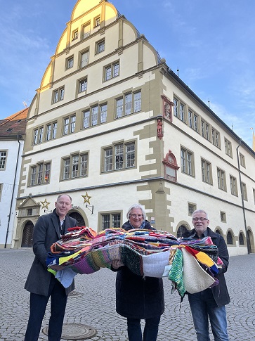 - Bürgermeisterin Astrid Glos und Bürgermeister Manfred Freitag übergeben OB Stefan Güntner den „Schal der Demokratie“.