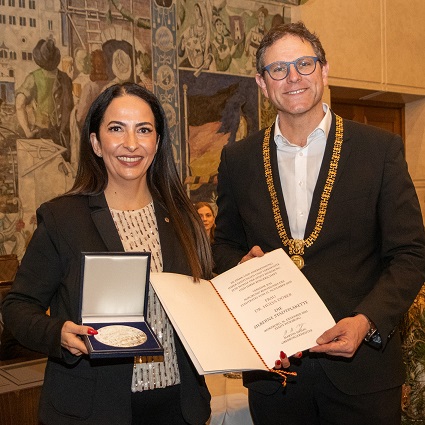 Bundestagsabgeordnete Dr. Hülya Düber erhält aus den Händen von Oberbürgermeister Martin Heilig die Silberne Stadtplakette.