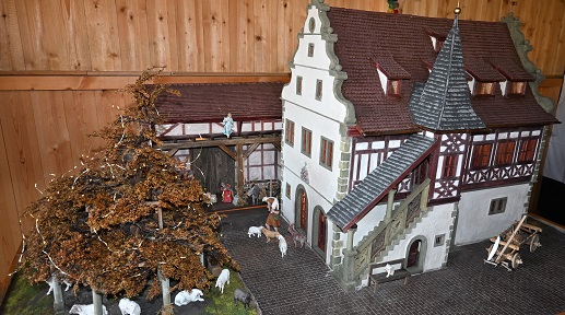 Schließlich entstand eine Krippe im Geldersheimer Untertor und eine neben dem Historischen Rathaus von Grettstadt. Der persönliche Bezug zur Geographie seiner Krippen ist für Wilfried Funke sehr wichtig. So stammt seine Frau aus Grettstadt, er selbst ist gebürtiger Geldersheimer und jetzt leben beide in Gädheim. Sie sind begeisterte Bergwanderer und erinnern sich gerne an bestimmte Urlaubsorte, womit schon mal eine größere Auswahl an Gebäuden gegeben war.