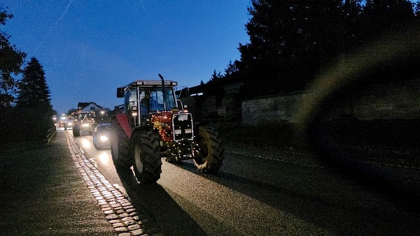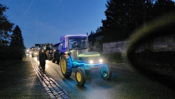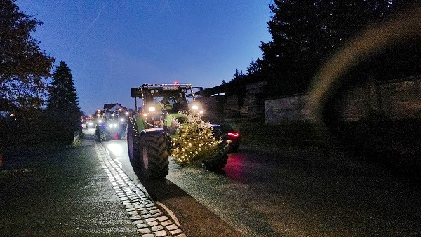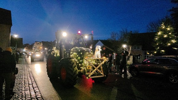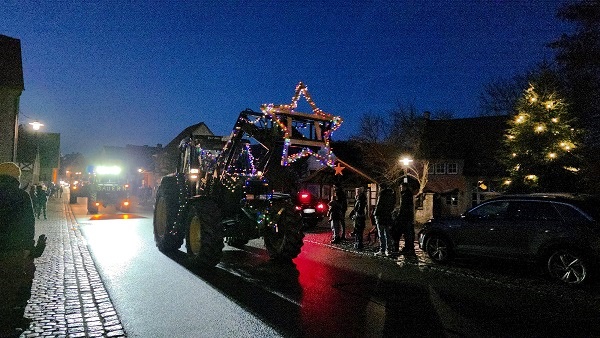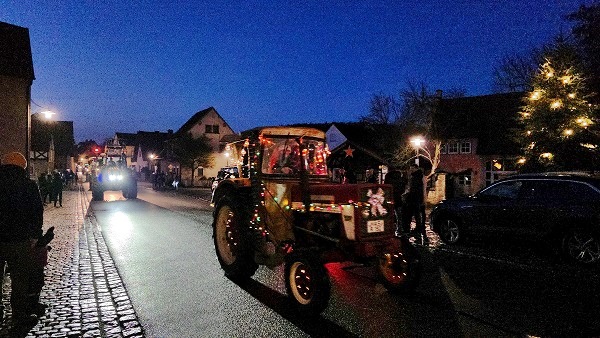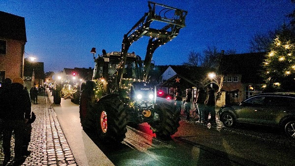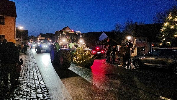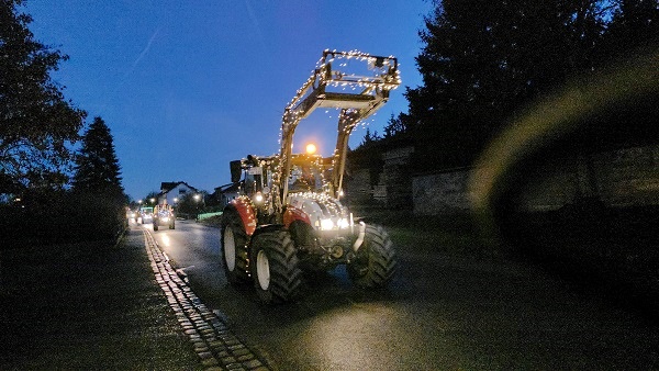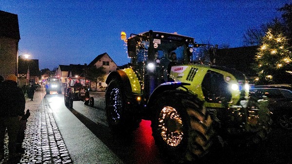 Warum? Schnell sprach sich herum, dass eine Lichterfahrt ansteht. Und siehe da: Kurz vor 17 Uhr kamen die beleuchtenden Traktoren. Zu diesem Zeitpunkt waren die beiden Schonunger schon wieder unterwegs zurück nach Oberschleichach – im Wissen, dass die Gefährte dorthin ja nun kommen würden.