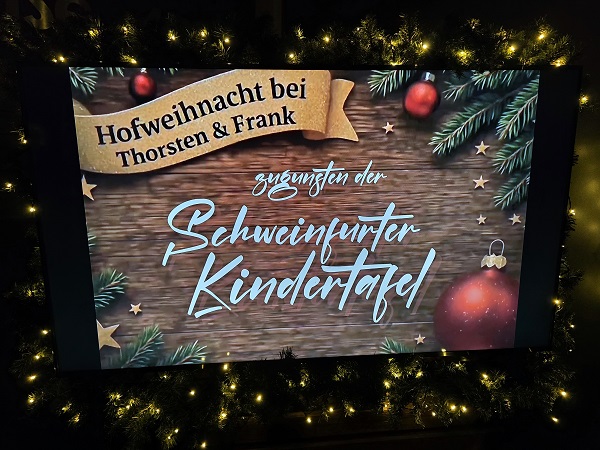 Die Idee zur „Hofweihnacht“ hatten Thorsten und Frank bereits zu Coronazeiten, als es keinen Weihnachtsmarkt gab und die beiden eben bei sich mit den Nachbarn im Freien und Rahmen des Erlaubten ein paar Glühwein tranken. Die letzten Jahre wurde die Veranstaltung immer größer und spendete das Paar den Erlös an eine Hilfsaktion von Antenne Bayern. „Als wir aber durch einen Stand bei der ´Nacht der Toleranz´ in Wiesentheid auf die Kindertafel aufmerksam wurden, war uns klar, dass wir das Geld in der Region lassen wollen“, erklärt Thorsten Schmälzle.