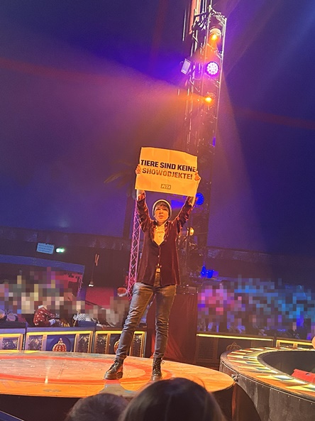 „Die Störung der Show macht sichtbar, was viele lieber ausblenden: Tiere, die im Zirkus für Kunststücke ausgebeutet werden, müssen gehorchen und können nie selbst wählen. Wir haben den Ablauf kurz unterbrochen, damit das Publikum einen Moment hinschaut. Jede Nummer zeigt, wie stark die Tiere unter Zwang leiden. Wir setzen uns dafür ein, dass dieser Missbrauch endet, und bitten alle Menschen, sich in die Tiere hineinzuversetzen und solche Shows nicht zu unterstützen“, erklärt Noemi Salewski, Aktionskoordinatorin bei PETA.