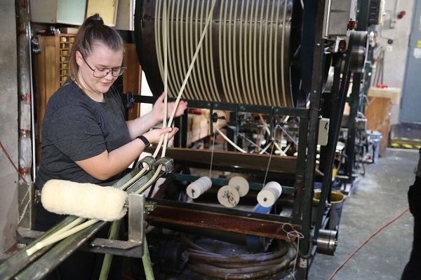 Zurück in der Fabrikhalle geht Schenk zu einer länglichen, breiten Maschine und schaltet sie ein. Es handelt sich um eine Wachszugmaschine aus 1949, das Herzstück der Fabrik. Sie wird vor allem für die Herstellung von Christbaumkerzen eingesetzt. Auf zwei großen, sich drehenden Walzen, den Zugtrommeln, sind 386 Meter Kerzendocht aufgespannt. Die Enden des Dochts sind miteinander verbunden. So entsteht ein Kreislauf, in dem der Docht konstant durch ein Becken mit flüssigem, dampfendem Wachs gezogen wird. Nach dem Wachsbecken wird der Docht glattgestrichen und begradigt, damit keine Wachsrückstände zurückbleiben. Auf dem langen Weg über die Zugtrommeln kühlt das Wachs ab. Im Wachsbecken wird dann eine weitere Schicht Wachs auf den Docht aufgetragen. Schenk begutachtet den Prozess genau. Immer wieder streicht er leicht über die Fäden, die noch so dünn aussehen, als ob sie schon bei der kleinsten Berührung reißen könnten.