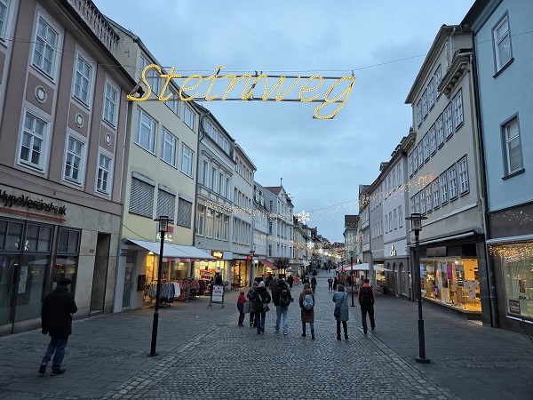 Mitten in Coburg war durch den Weihnachtsmarkt natürlich die Fußgängerzone sehr belebt. Auch wenn im Bereich des Steinwegs in Richtung Filmtheater im Norden die Attraktivität der Geschäfte gefühlt von Jahr zu Jahr nachlässt.