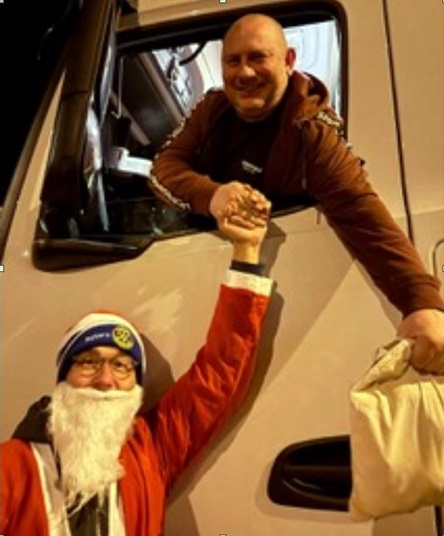 „Diese Männer sind das ganze Jahr für unsere Versorgung unterwegs, selbst über die Feiertage. Das wollten wir würdigen“, erläutert Clubpräsident Manfred Pabst, der mit zwei weiteren Clubfreunden, darunter der Weihnachtsmann persönlich, insgesamt 50 Tüten voller Süßigkeiten, Lebensmittel und Getränke verteilte. Das Projekt „Trucker-Weihnachten“ wurde im Jahre 2022 vom Rotary Club Heilbronner Land gestartet und mittlerweile als bundesweite Hans-on-Aktion von rund 100 Rotary-Clubs unterstützt.