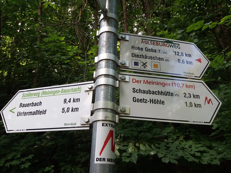 Der Weg gabelt sich nach links und rechts, wir steigen nach links hoch zur leider (zumindest beim Wegverlauf) nicht gut besichtbaren Goetzhöhle, an der es vorbei weiter nach oben geht zu einem ersten Aussichtspunkt mit Blick auf die Stadt Meiningen. Den anstrengendsten Part der Tour haben wir nun hinter uns.