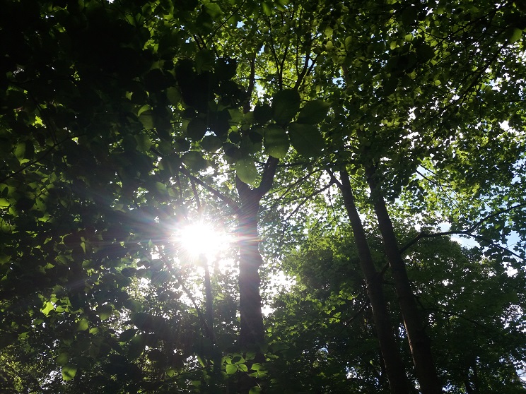 Jetzt geht´s nach Westen. Wir laufen lange ebenerding durch den Wald, sehen – als wir aus ihm heraus kommen – hinter und nun das gewaltige Klinkum Meiningen. Wir biegen nach rechts ab, erreichen einige Zeit später den Henriettenplatz, an dem man unter schattigen Bäumen gut verweilen kann.