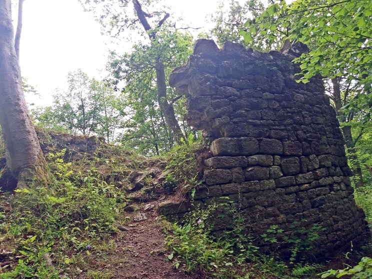 Wieder biegen wir nach rechts ab und laufen dann ganz lange im Zick-Zack-Kurs durch den Wald. Das alles ist gut beschildert mit einem roten „M“ auf weißem Untergrund. Bei etwa der Hälfte der Strecke erreichen wir den Höhepunkt: Die Ruine der einstigen Habichtsburg, freilich nicht so beeindruckend wie manche andere. Doch sie stand auf einem 40 Meter hohen Felsen über der Haßfurtschlucht – und alleine schon das Erkunden, warum diese Schlucht nach der unterfränkischen Kleinstadt benannt ist, macht neugierig.