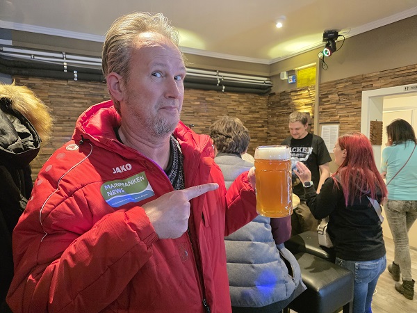 „Fast“ deshalb, weil Michael schweren Herzens nur Station eins wieder verließ nach gerade mal einer halben Halben. Es sollte das beste Bockbier des Tages sein bei den Kommunbrauern in Rügheim bei Hofheim im Landkreis Haßberge. Dort hat man auf einem Plakat mit einem wirklich grimmig ausschauenden Bock Werbung und neugierig gemacht. Es gab die legendäre Rügheimer Bratwurst als Stärkung am Mittag. Michael wäre nun auch gleich dauerhaft dort geblieben. Freilich war es mit Minus 5 Grad auf dem Vorplatz richtig kalt im Freien. Und es lockten drei weitere Stuben.