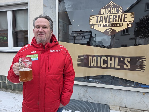 Abhaken und nach vorne schauen. Bad Staffelstein hieß die nächste Station. Michael hätte zu gerne wieder die Brauerei Trunk oberhalb von Vierzehnheiligen angesteuert. Doch Petra wollte zu einem echten Bockbier-Anstich. Ban-Bräu in der Innenstadt in der Bahnhofstraße gibt´s erst seit 2024. Das kleine Stehlokal (mit einem bei minus 5 Grad nicht hilfreichen, kleinen „Biergarten“) war brechend voll. Und der „Waldinator“ erwies sich genau nach dem Geschmack von Michael. Süffig und hopfig. Doch als weiterhin Fahrer durfte er nur eine halbe Halbe trinken. Zum Trost gab´s Fotos vor der benachbarten „Michl´s Taverne“…