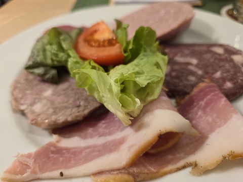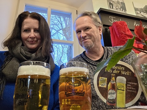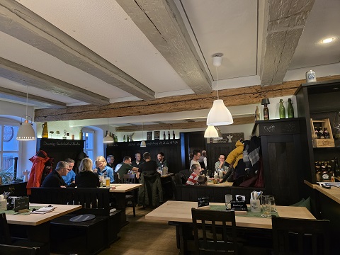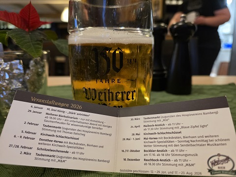 Einmal gab´s die Hausmacherplatte (gemischter Preßsack, Göttinger, roher Schinken, Hartwurst) und einmal die Brauerplatte (Dosenfleisch, Göttinger, roher Schinken, Hartwurst, Mettwurst). Beim Rausgehen aus dem Lokal stolperten die Gäste aus Unterfranken noch über Braumeister Roland Kundmüller 😉 Stärk´ ist angetrunken, 2026 kann losgehen!