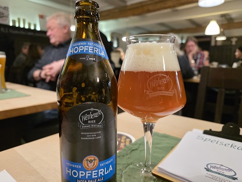 Also gab´s den Rauchbock, der – wie sich später heraus stellte – als normales Rauchbier eingeschänkt wurde. Genauso lecker – aber halt mit ein paar Umdrehungen weniger. Der normale Bock kam danach ins Glas, 6,6 Prozent sind hier erträglich. Und ließen noch ein Fat Head´s Hopferla IPA zu. Das ist Michael Lieblingsbier, das leckerste überhaupt, mit 7,5 Prozent jedoch ziemlich heftig, was man beim Trinken gar nicht merkt.
