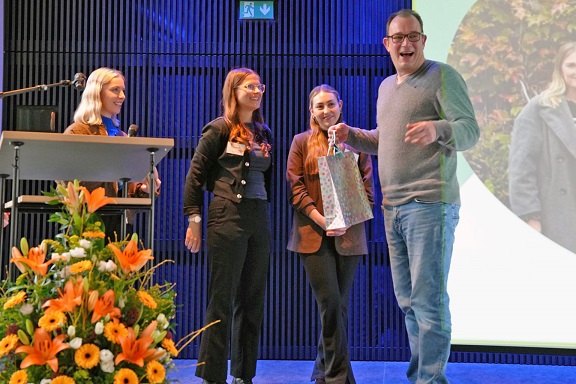 Lisa Fähr (2. v. li.) und Mona Schubert (3. v. li.) bedanken sich bei Volker Wedde vom Handelsverband Bayern e. V. für die Unterstützung während des vergangenen Semesters (Foto: THWS/Anne Speda)