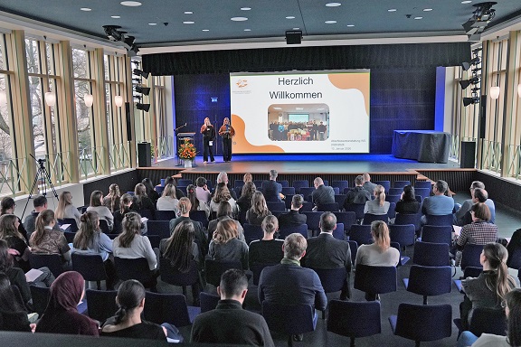 Rund 60 Personen, darunter die Studierenden des Studienschwerpunkts Personalmanagement der THWS Business School sowie die Projektverantwortliche Prof. Dr.-Ing. Christine Wegerich und ehemalige, aktuelle sowie zukünftige Projektfallgeber und weitere Gäste, besuchten die Abschlussveranstaltung des Wintersemesters 2025/26 (Foto: THWS/Anne Speda)