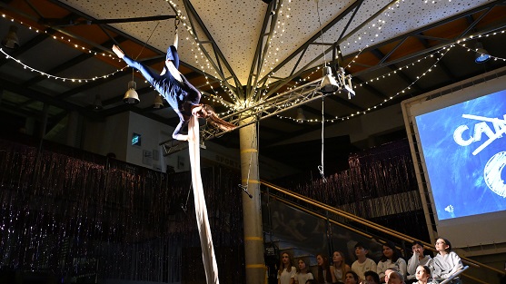 Amelie Burgos kletterte an den Tüchern bis zur Decke der Schulaula und ließ sich dann am Tuch nach unten rollen.