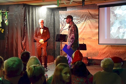 Gemeinsam mit Bruder Jannik, der den Obergefreiten mimte und dem Bauernfünfer, brillierte diese Zusammensetzung einmal mehr, zur Freude des Publikums. Den Schlusspunkt setzte das Männerbalett (Gabriel Ziegler, Mario Ziegler, Marco Weber, Justin Michel, Simon Michel, Vincenz Hofmann, Lukas Peter, Timo Rüger, Jan Göbel und Leo Brand), die als afrikanische Krieger mit ihren Speeren von der Jagd kamen. Zum abschließenden Finale versammelten sich alle Akteure des Abends gemeinsam auf der Bühne und zogen mit einer Polonaise durch das Sportheim.