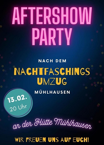 Für alle Teilnehmer und Gäste gibt es im Anschluss noch eine After-Zug-Party in der Hütte Mühlhausen. Hierfür ergeht an dieser Stelle natürlich eine herzliche Einladung!