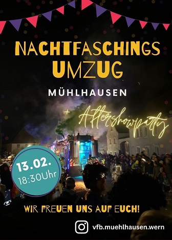 MÜHLHAUSEN BEI WERNECK – Ein Nachtfaschingsumzug in Mühlhausen? Ja, das stimmt! Und zwar am Freitag, den 13.02.2026 um 18:30 Uhr wird sich der Gaudiwurm durch Mühlhausen (bei Werneck) schlängeln, im Idealfall unter dem Beifall von vielen fanatischen Faschingsjecken. Natürlich sind auch alle willkommen, die einfach nur mal schauen wollen, was da abgeht.