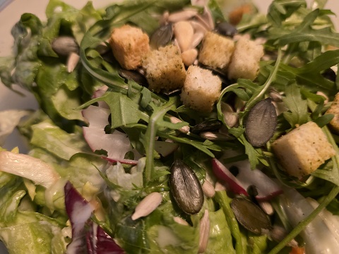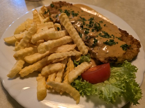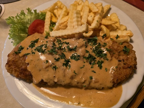 Natürlich muss man dazu dann auch „was G´scheits“ essen. Die Auswahl war groß – und zu jeweils einem Beilagensalat entschied sich Petra für das Rahmschnitzel mit Pommes Frites und Michael für den Leberkäs´ mit einem Spiegelei und fritierten Kartoffelscheiben. Wer die Bilder sieht, wird verstehen, warum es die beiden vom Landkreis Schweinfurt immer wieder über den Landkreis Haßberge in den Landkreis Rhön-Grabfeld verschlägt.