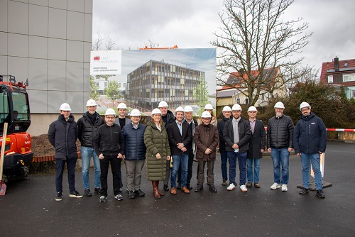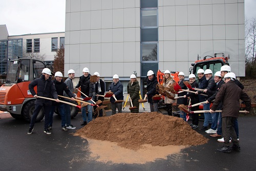 Fabian Ziegler (IB Burmester & Partner), Thomas Wieden (Architekturbüro Holl Wieden Partnerschaft), Stefan Sauer (IB Burmester & Partner), Thomas Zöller (Ständiger Vertreter des Schulleiters JGS), Udo Feldinger (Mitglied Berufsschulbeirat Sachaufwandsträger,) 3. Bürgermeisterin Judith Roth-Jörg, Martin Reith (Schulleiter JGS), Luka Campanozzi (Freunde der Meisterschulen), Günther Beuchert (ehem. Schulleiter JGS), Erhard Drexler (weiterer ständiger Vertreter des Schulleiters JGS), Daniela Schuster (Fachbereichsleiterin FB Schule), Sebastian Jung (FA Schulbau und Gebäudemanagement), Paul Geier (Förderverein der JGS), Marco Dietz (Personalrat JGS), Alexander Kraft (FA Schulbau und Gebäudemanagement), Christian Sälzer (IB Kimmelmann + Sälzer) vor dem geplanten Anbau der Josef-Greising-Schule