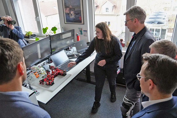Wie „Deutschlands gefährlichster Schreibtisch“ aussehen kann, erfuhr StM Markus Blume (2. v. re.), indem er potenzielle Gefahrenquellen an Hardware des TTZ-WUE selbst ausprobierte (Foto: THWS/Tobias Hestner)