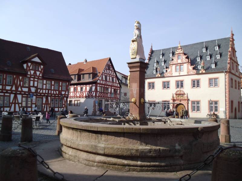 - Groß-Umstadt: …. liegt nur wenige Kilometer von der Burg in nördlicher Richtung. Die „Odenwalder Weininsel“ mit ihren knapp 22.000 Einwohnern gehört zum Landkreis Darmstadt-Diebach. Hier wird Wein angebaut, ist das jährliche Winzerfest ein großes Ereignis. Eine große portugiesische Gemeinde in der Stadt trägt zum Bild bei. Wer sich im Sport auskennt: Die lokalen Handball-Männer spielen in der 3. Bundesliga Süd mit. Sehenswertester Ort der Stadt ist Groß-Umstadts Marktplatz mit dem Renaissance-Rathaus. Von hier aus führen Gassen mit zahlreichen Fachwerkhäusern zu sechs von ehemals sieben Schlössern oder Adelshöfen.