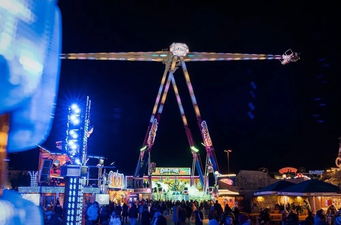 In diesem Jahr konnte ein Hochfahrgeschäft neuester Bauart für das Schweinfurter Volksfest gewonnen werden: EVOLUTION. Als eines der höchsten Flugkarussellneuheiten ging es im März 2024 in Betrieb. Die beiden Rotationsarme tragen je vier Gondeln mit je vier bequemen Sitzen. Bei der Fahrt drehen sich die Arme im Kreis, so dass die Gondeln am höchsten Punkt einen Überschlag absolvieren und die Passagiere bei einer Flughöhe von 66 m mit bis zu 140 km/h kopfüber durch die Luft befördert werden. Jeder Fahrgast hat dabei eine eigene Videokamera schräg über sich, die die Fahrt für einen späteren Download des persönlichen Videos aufzeichnet (DSGVO-konform mit Gesichtserkennung).