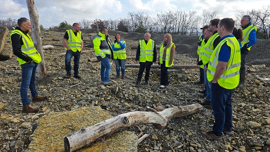 - Landrat Thomas Bold (5. von links) und Nadine Hochrein, Geschäftsführerin der Schotterwerke Hochrein GmbH (rechts daneben), mit Vertretern des Landesbunds für Vogel- und Naturschutz sowie der Höheren und Unteren Naturschutzbehörde auf dem Areal des Steinbruchs. Hier finden seltene Tierarten einen Lebensraum.