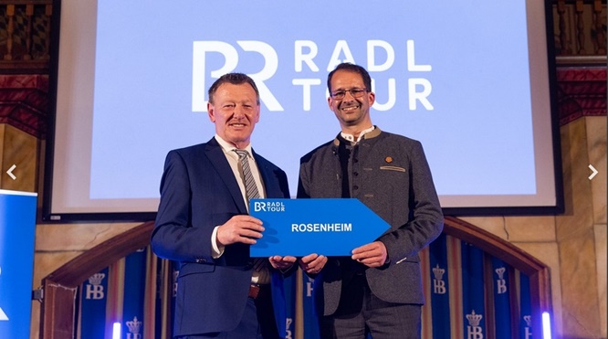 Streckenbekanntgabe BR-Radltour 2026: Peter Juks (Erster Bürgermeister Ochsenfurt) übergibt an Andreas März (Oberbürgermeister Rosenheim).