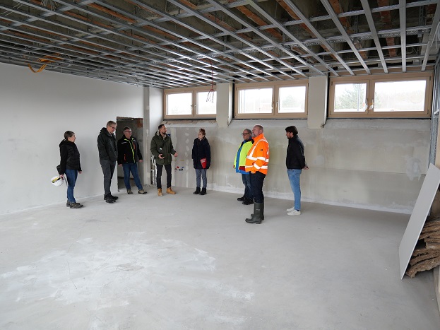 2: Landrat Thomas Eberth (Zweiter von rechts) macht sich mit dem Architekten Stefan Schubert (Vierter von links) und einer Abordnung des Landratsamts Würzburg ein Bild vom Fortschritt der Arbeiten an der Höchberger Drei-Linden-Schule.