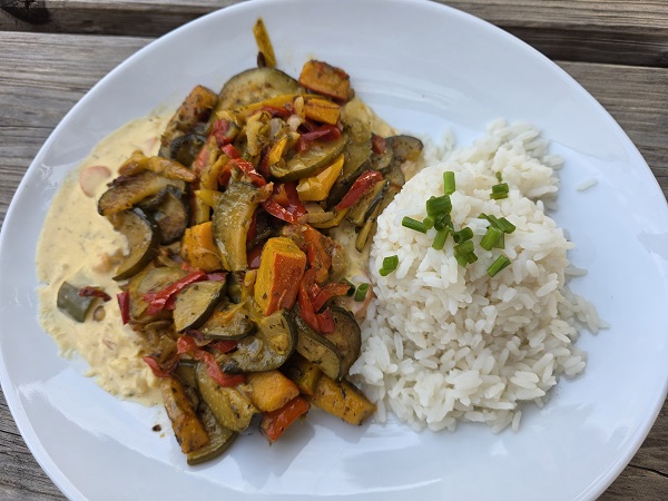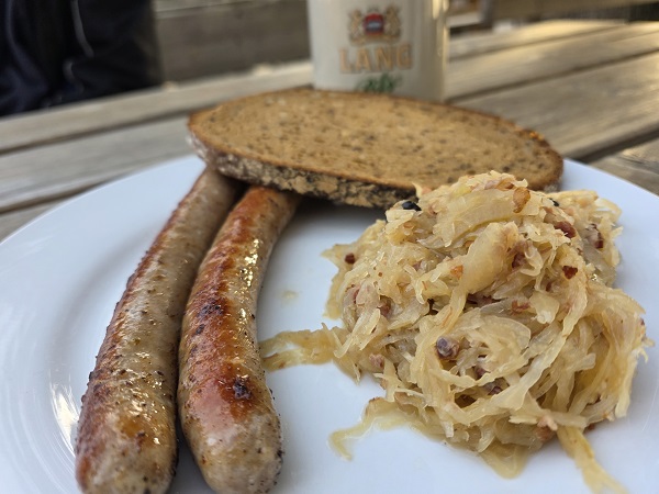 Auf die Teller kamen zwei Mal ganz klassisch die fränkischen Bratwürste mit einem überaus schmackhaften Sauerkraut und dazu ein Zwiebelbrot. Andreas entschied sich für die vegetarische Speise. Leckeres Gemüse zu Reis. Kann man alles mal machen…