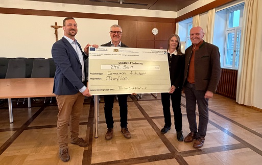 Für das LEADER-Projekt „Durfblatz“ bekam die Gemeinde Aubstadt den Zuwendungsbescheid überreicht. Es freuen sich (von links) LEADER-Koordinator Daniel Pascal Klaehre, Aubstadts Bürgermeister Burkhard Wachenbrönner, Regionalmanagerin Ursula Schneider und Landrat Thomas Habermann. (Fotos: Christina Leutbecher / Landkreis Rhön-Grabfeld).