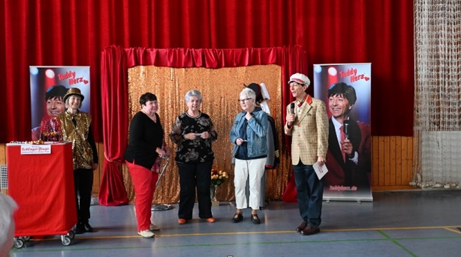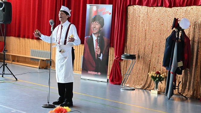 Zunächst wurden Kaffee, Kuchen und kalte Getränke serviert, bevor der Coburger Teddy Herz zur Deutschen Schlagerrevue mit Liedern der 50er und 60er Jahre und eigenen Titeln einlud. Es wurde gerockt, denn „Rock‘n Roll hält jung“. Dann folgten „Marina“ von Rocco Granata und „Rote Lippen soll man küssen“ von Cliff Richard. Rasch umgewandet in Outfits der MDR-Schneiderin Uliena Richter bot der Interpret zwei eigene von Christian Bruhn geschriebene Titel „Ich bin der Schlagerkapitän“ und „Hauptmann der Herzen“.