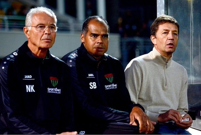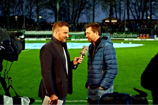 Unsere drei Bilder zeigen Dr. Reiner Wirsching bei einem Interview im Sachs-Stadion, als Mannschaftsarzt auf der Bank neben den beiden Co-Trainers Norbert Kleider und Stefan Braungardt sowie als Spieler links neben seinem Bruder Dieter (rechts) und in der Mitte Ersatz-Keeper Marius Todericiu, der bereits 2019 mit nur 49 Jahren verstarb.