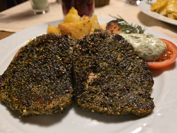 Auf der Wochenkarte, die sich im Internet unter https://linde-hotel.de/ findet, steht immer mal wieder das Kräutersteak. Und selbst wenn man es dort nicht findet, so besteht die Möglichkeit, es mit einem Anruf mit ein, zwei Tagen Vorlauf vorzubestellen. Aber was heißt Kräutersteak? Es sind ja zwei pro Teller!