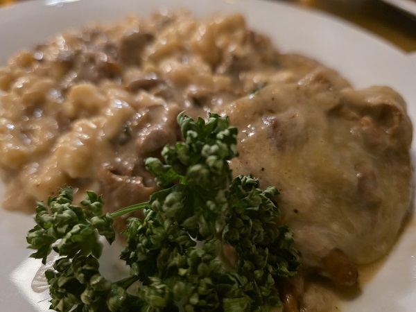 Zwischen der gefüllten Gans, den Käsespätzle und dem Kalbsnierenbraten war da zu lesen: „Wilderertopf“. Dahinter versteckte sich Schweinefilet mit Käse überbacken, mit Waldpilzsoße und Spätzle. Die Bilder dürften es beweisen: Es war mal wieder lecker, lecker, lecker…