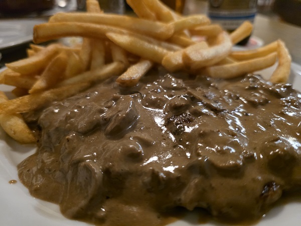 Nun gut, Michael vollendete seinen Jägerschnitzel-Zehner und wählte seine Leibspeise nun bereits zum zweistelligen Mal nacheinander. Natürlich mit Pommes Frites und einem Beilagensalat, den auch Petra zu ihrem Essen bekam, das auf der Tageskarte oder besser: Tagestafel neben der Eingangstreppe stand.