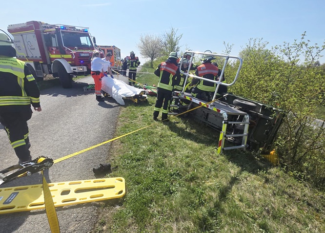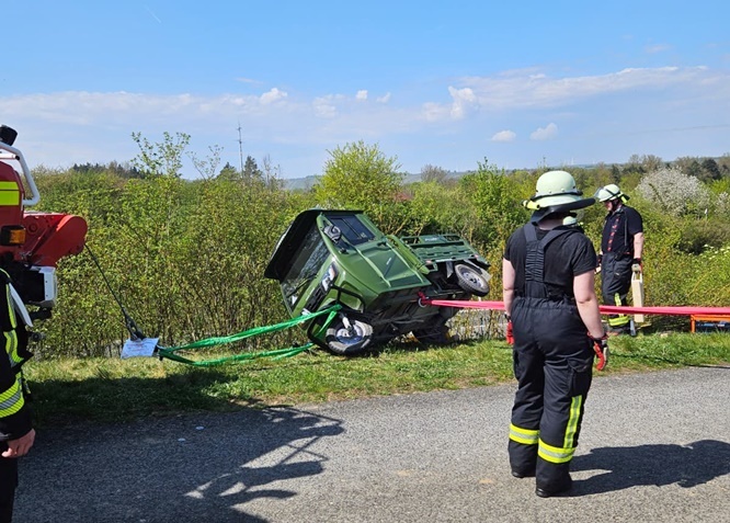 Aufgrund des steilen Hangs zur parallel verlaufenden Staatsstraße 2271 drohte das Vehikel samt eingeschlossenen Fahrer weiter hinunter zu stürzen.