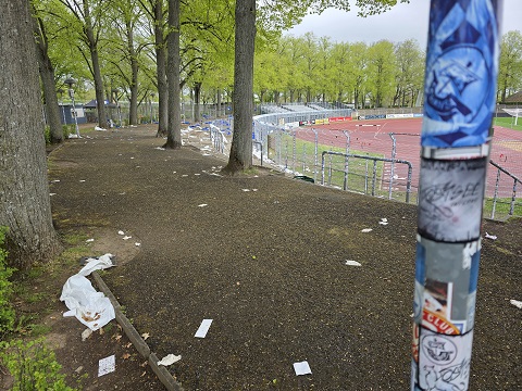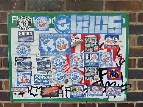 Beseitigen sollte seitens der Stadt oder vom FC 05 die Aufkleber besser niemand. Schon 14 Tage nach dem Gastspiel der Rostocker kommen ja die Münchner Löwen. Auch da wird der Gäste-Fanblock ausverkauft sein – und das Toilettenhäuschen und der Flutlichtmast dann anders dekoriert ausschauen. Zumindest in ähnlichen Farben…