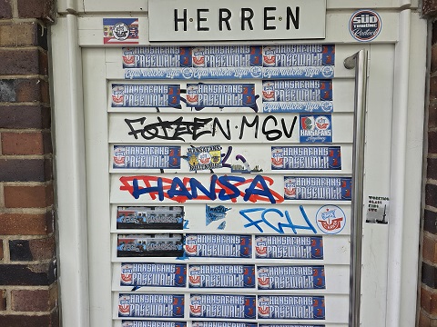 Oder besser: Die Fans des FC Hansa Rostock. Fast 3000 tummelten sich im Gästeblock und demzufolge im Bereich der Toilettenanlage gleich neben dem Verpflegungsstand. Dort sah´s nach der Partie aus… wie erwartet. Die Türen, die Wände und genauso der Flutlichmast waren komplett beklebt. Zur „Hansa Zone“ gemacht, so eine Aufschrift.