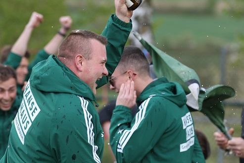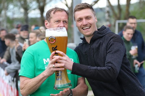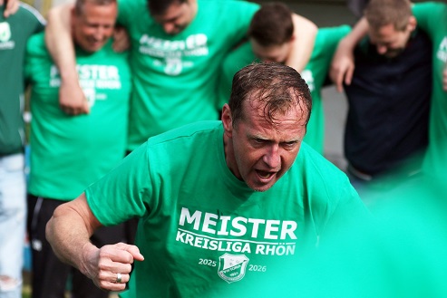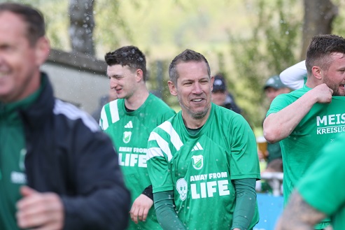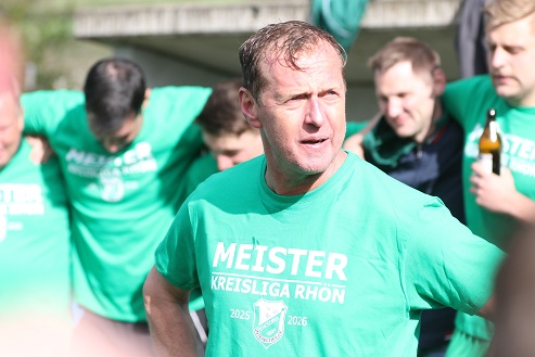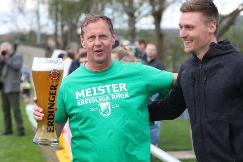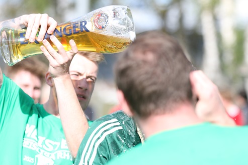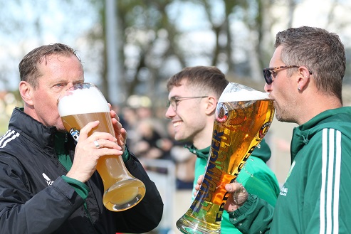 Diesmal kassierte Trainer Frank Halbig, der 2022 mit Oerlenbach/ Ebenhausen als Kreisklassen-Meister in die Kreisliga aufstieg und sich 2024 dort verabschiedete mit dem Relegations-Sieg gegen den Abstieg in Waldberg gegen die SG Hausen/ Nordheim, … diesmal kassierte der 57-Jährige früh eine doppelte Weißbier-Dusche.