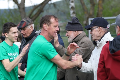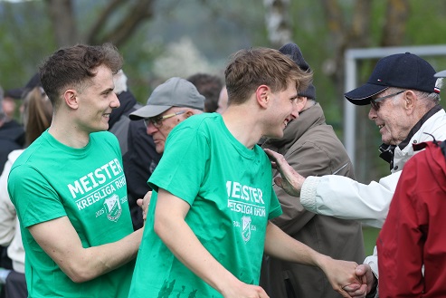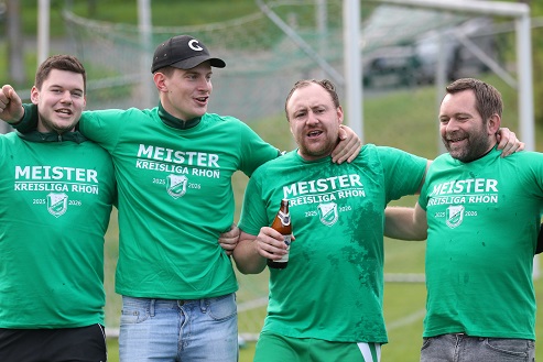 Die Meister-T-Shirts waren früh angelegt, damit ging´s zu gleich zwei Meisterschafts-Teamfotos, mit anschließendem Tanz. Nach rechts? Nach links? Nach vorne? Egal! Hauptsache feiern! Ein paar Seitenhiebe auf die Nachbarn aus Thulba und Obererthal durften natürlich nicht fehlen!